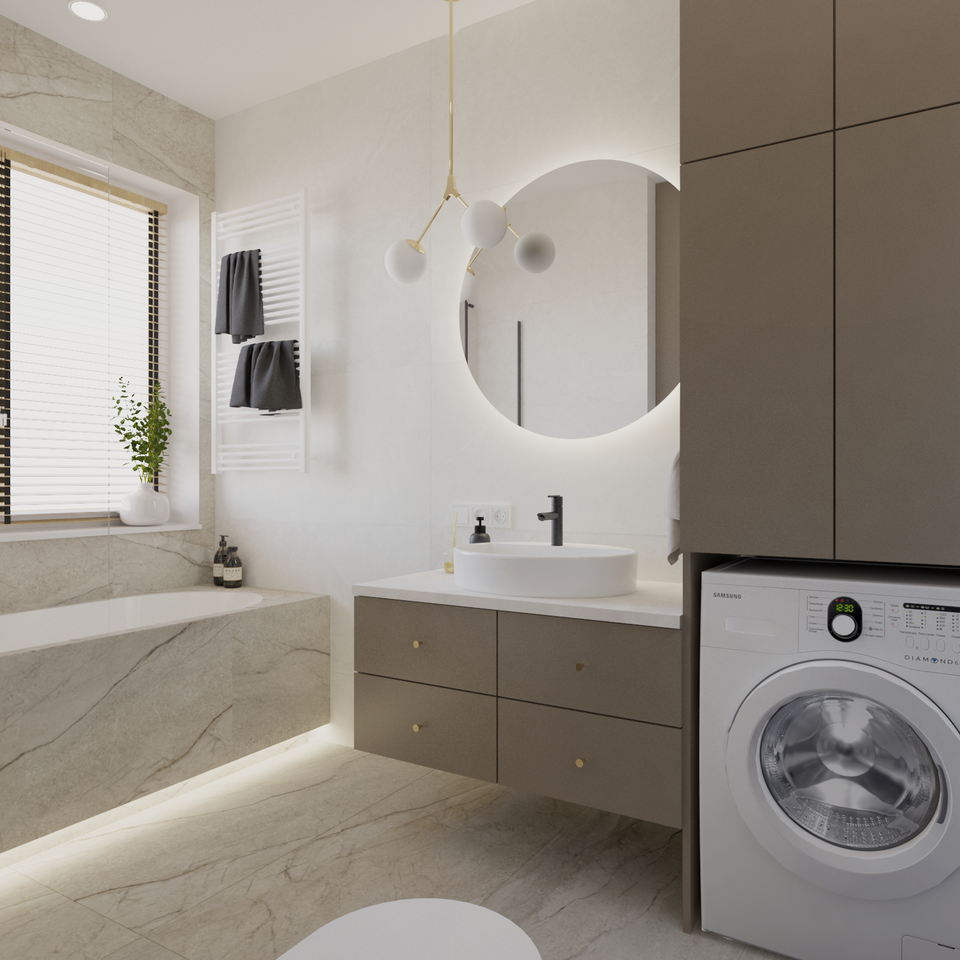 Po otrzymaniu pierwszych wizualizacji możliwe są maksymalnie 2 zmiany dotyczące materiałów, kolorów i elementów ruchomych wnętrza (wizualizacja nie obejmuje: pralni, pomieszczeń gospodarczych, garderoby).